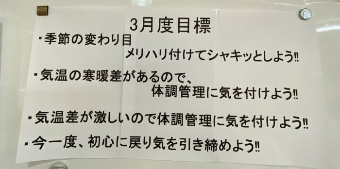 3月も半ばになり、新潟も少し春らしい気配が感じられてきました。 私たちは、毎月みんなで考えた目標を事務所に飾ってます。今月も、目標に沿って行動していきます! 季節の変わり目、朝晩の寒暖差で体調に不調が表れやすい季節ですので、皆様ご自愛くださいませ。