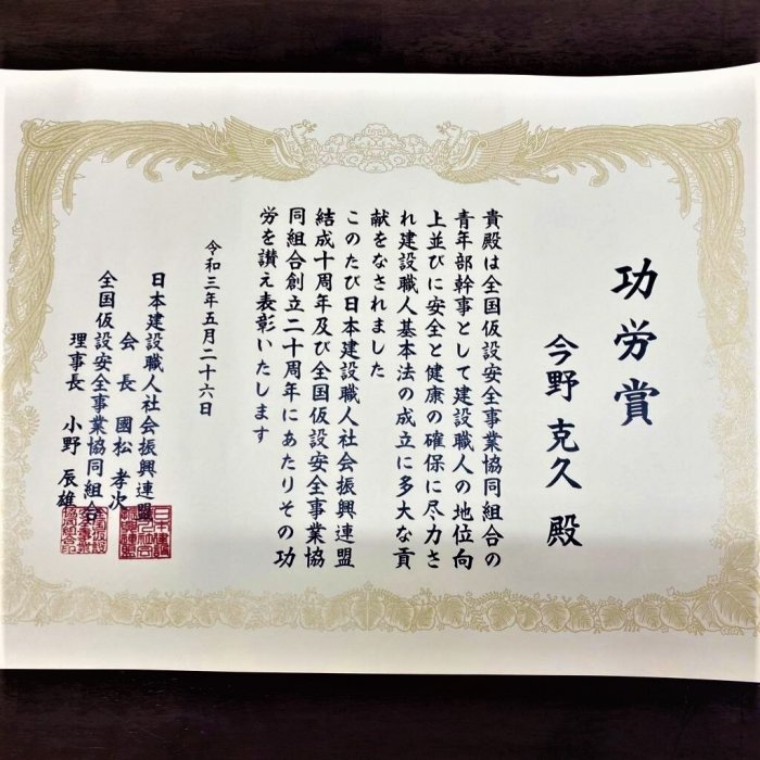 全国仮設安全事業協同組合様よりを功労賞いただきました。
