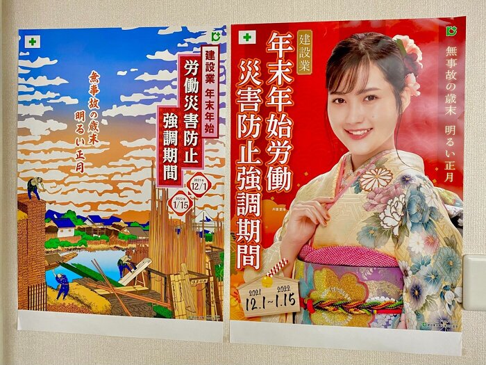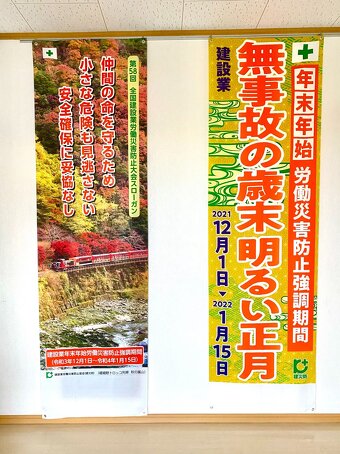 「建設業 年末年始」労働災害防止強調期間 2021年12月1日~2022年1月15日 本日から始まりました。 スローガンは、【無事故の歳末 明るい正月】 無事故無災害で年末年始を迎えるために、この活動を毎年行っていきます。